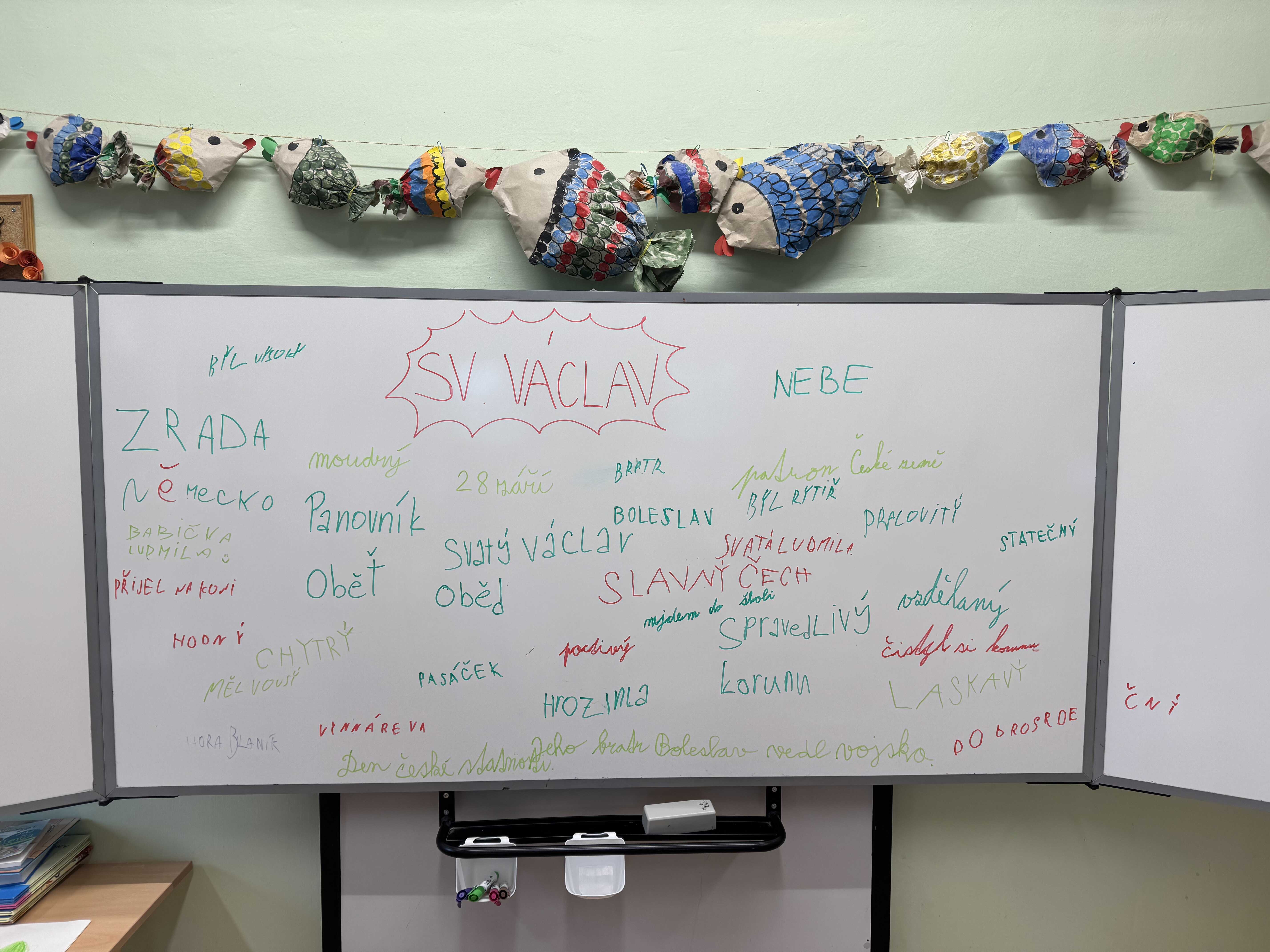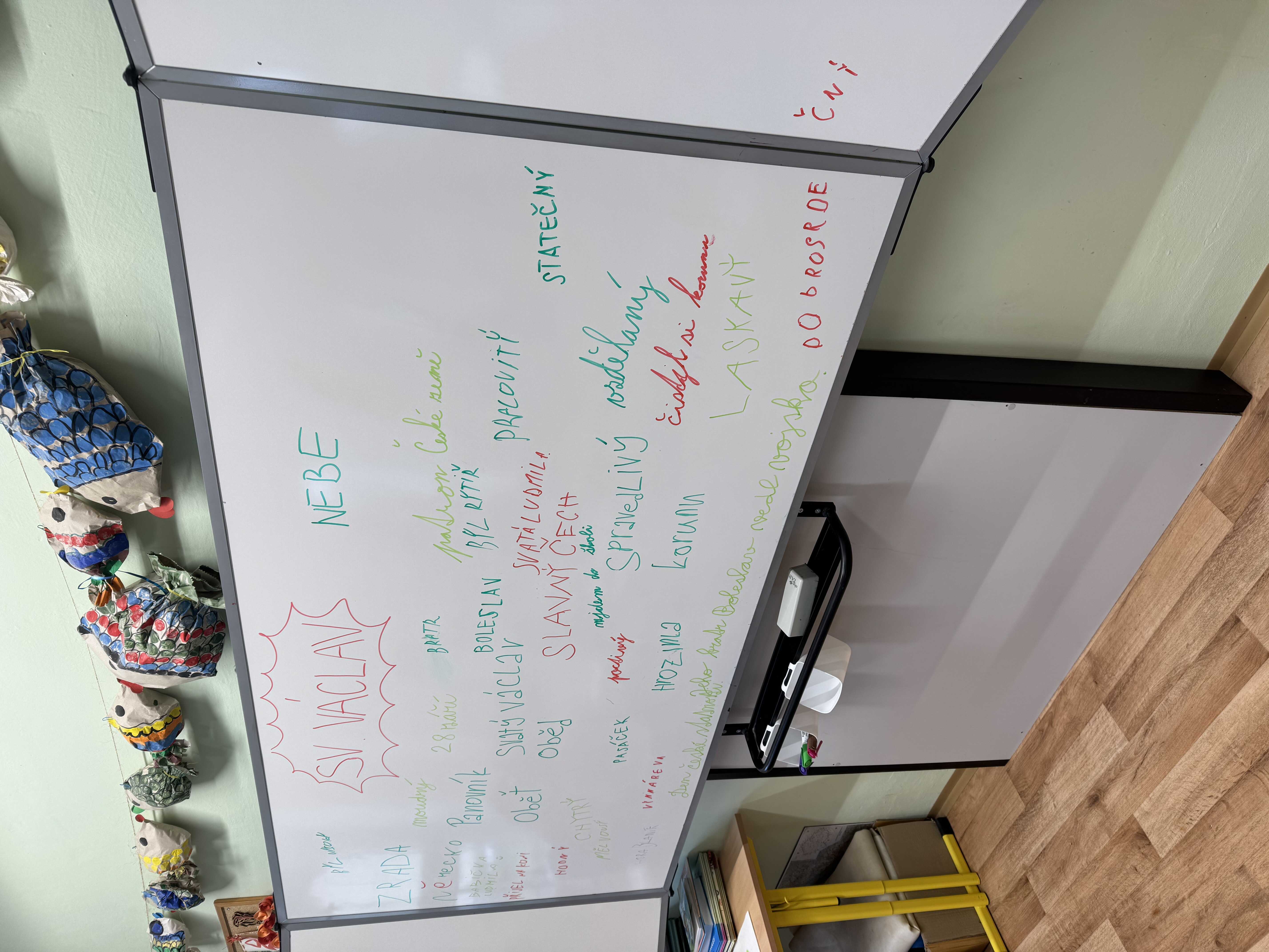 Přečetli a prodiskutovali jsme s dětmi příběh Svatého Václava. Ideální příležitost k vysvětlení si pojmu – kritické myšlení. Dále jsme si pustili videoukázku, kde byl Svatý Václav představen i mladším dětem. Následovala Svatováclavská bojovka, zpětná vazba, jak děti naslouchaly. Po škole děti měly rozmístěny otázky, odpovědi zapisovaly do pracovních listů. Dětem byly představeny místa, kde všude se můžeme setkat se Svatým Václavem...Taktéž si prohlídly dvacetikorunovou minci, kde je rovněž vyobrazen Svatý Václav. Poté si děti vymalovaly omalovánku – Svatého Václava na koni a vyrobily si Svatováclavskou korunu.