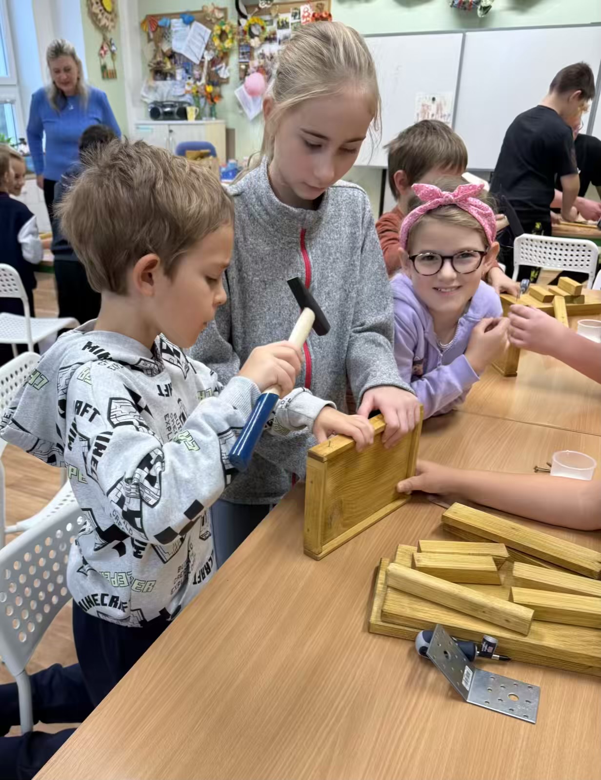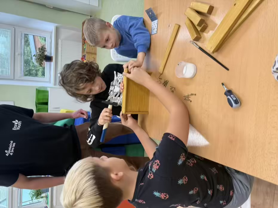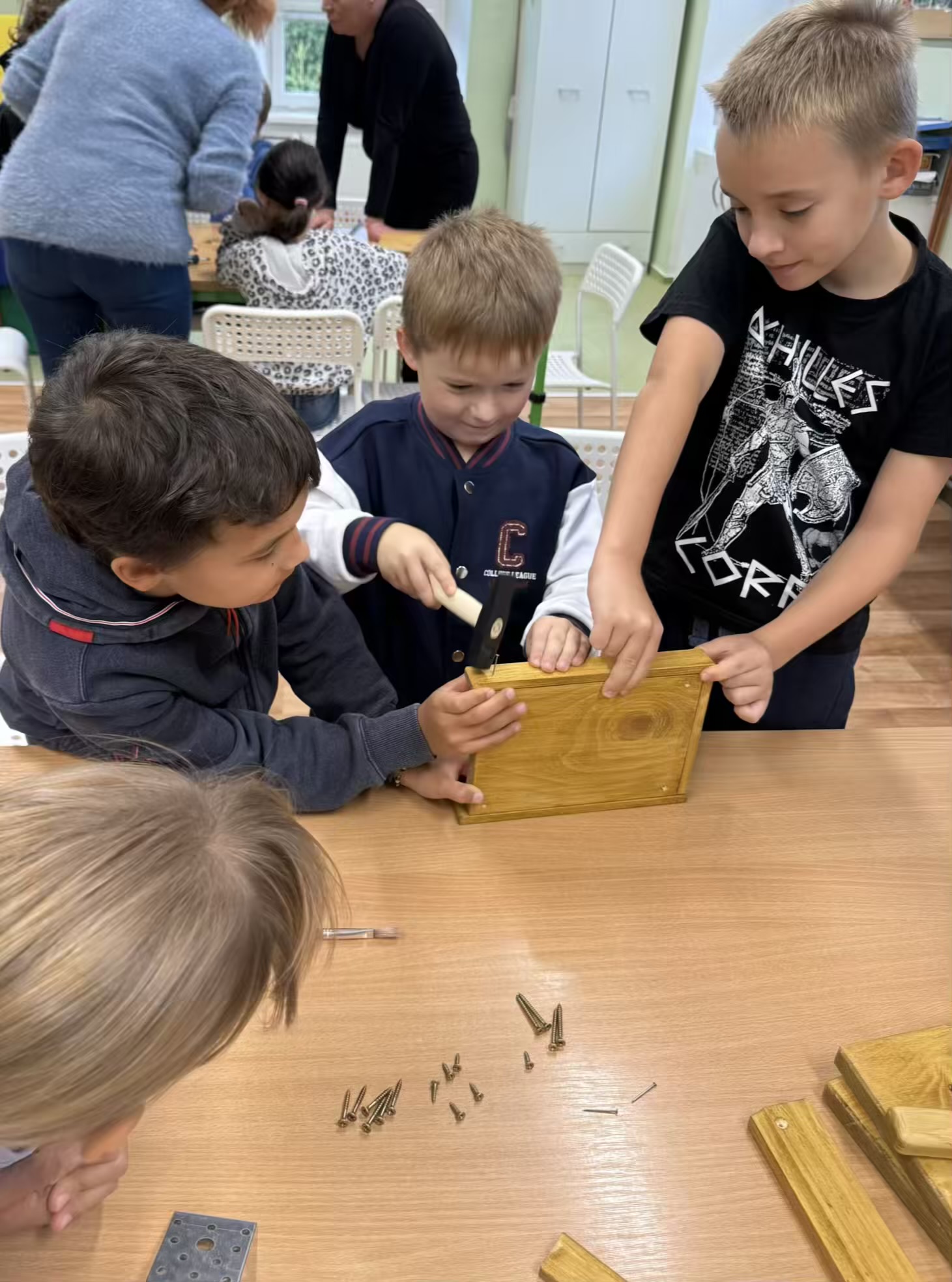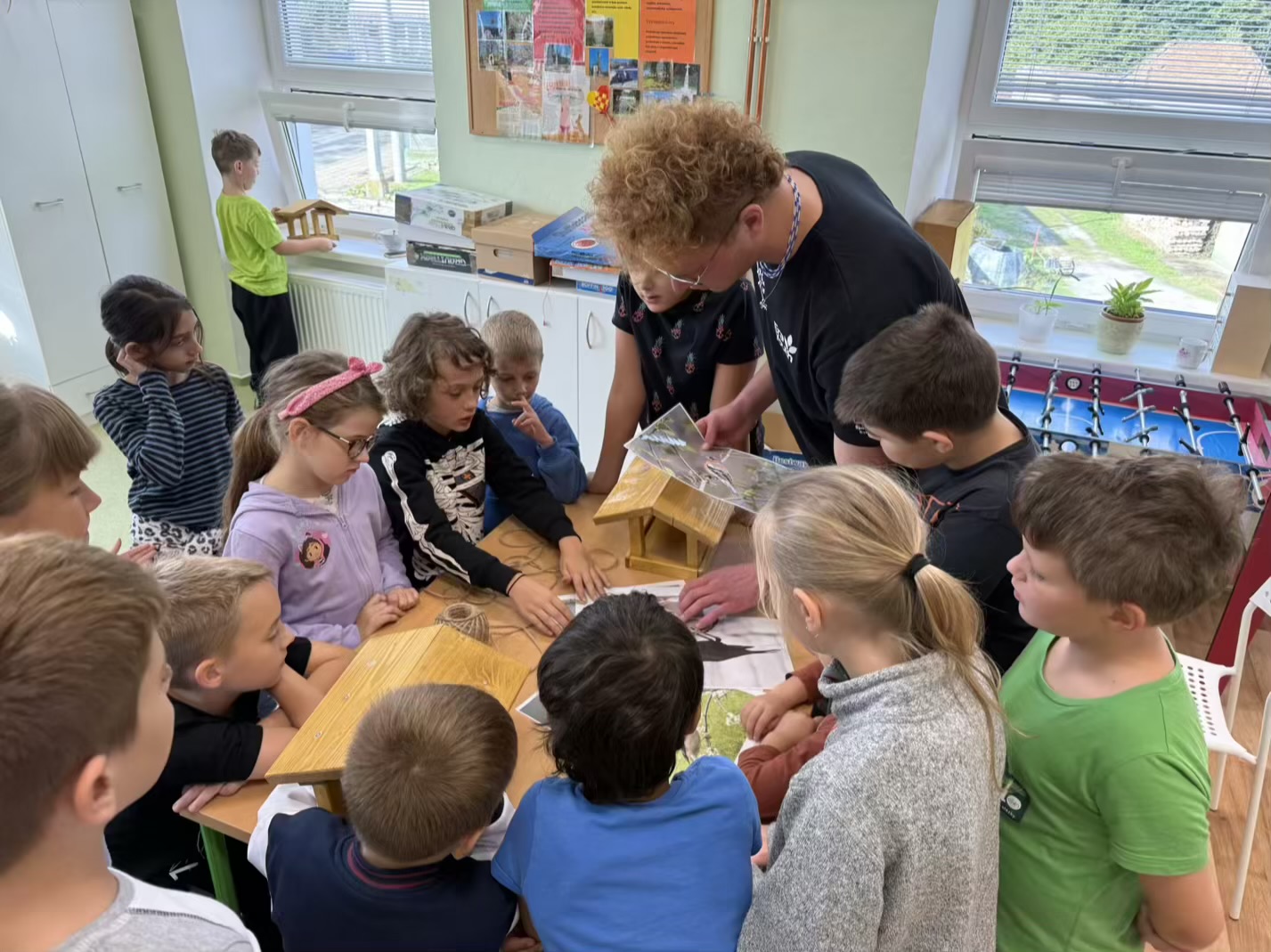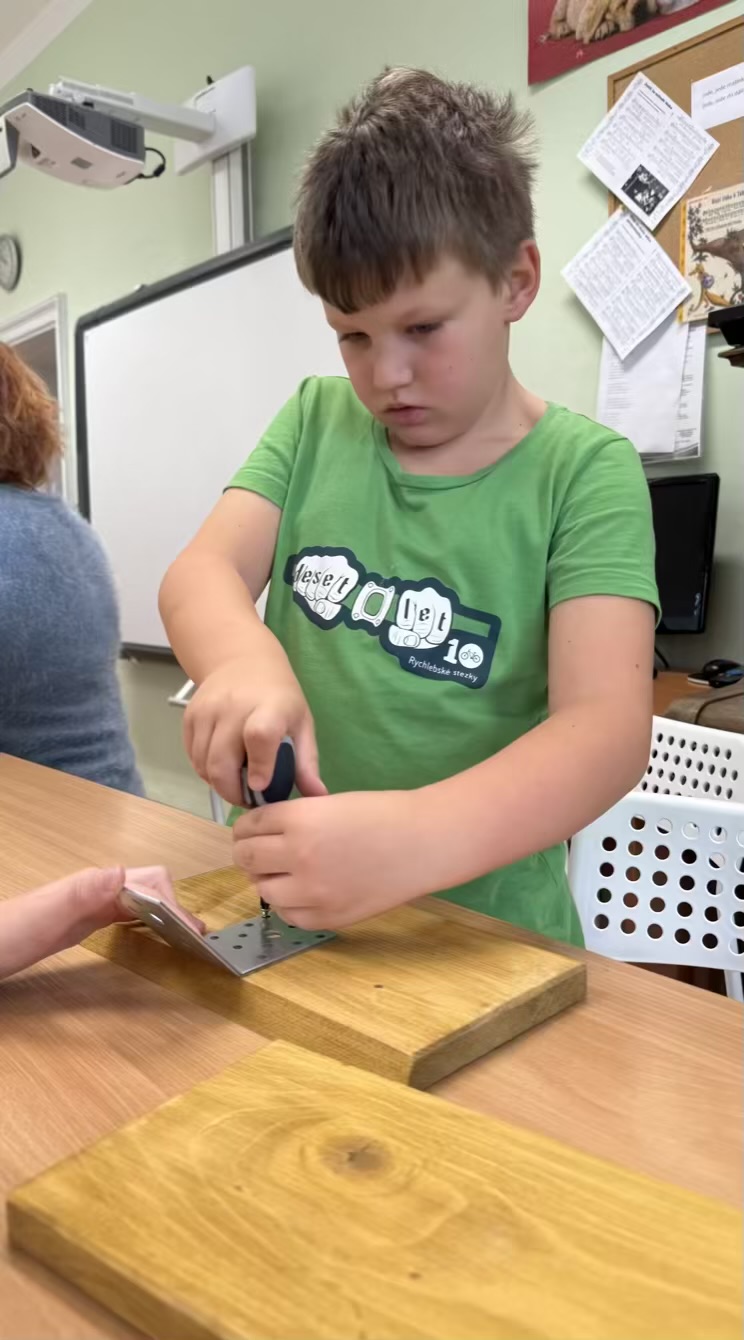 Naše škola se na chvíli změnila v továrnu na krmítka pro opeřence. Pod zkušeným vedením pana Romana Welce se děti pustily do stavby ptačích krmítek. Místo vrtaček a velkých strojů jim stačily šroubováky a kladívka – a nutno říct, že s nimi zacházely s takovou jistotou, že by leckterý domácí kutil mohl zčervenat závistí.