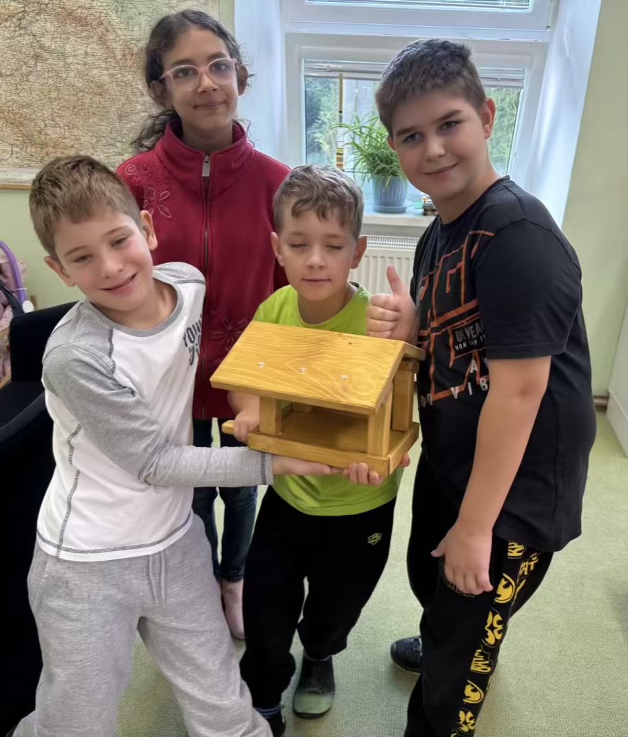 Každý hřebíček i šroubek mířil přesně tam, kam měl, a i ti nejmladší ukázali, že když jde o dobrou věc, dokážou pořádně zabrat. Krmítka se povedla tak, že se na ně ptáci jistě budou zapisovat do pořadníku. Už teď si představujeme, jak si budou psát recenze: „Výborná kuchyně, krásný interiér, přátelský personál.“ Některá krmítka jsme pověsili na školní zahradě, tři poputují k domovu důchodců do parku, kde se jistě postarají o radost seniorům i kolemjdoucím.