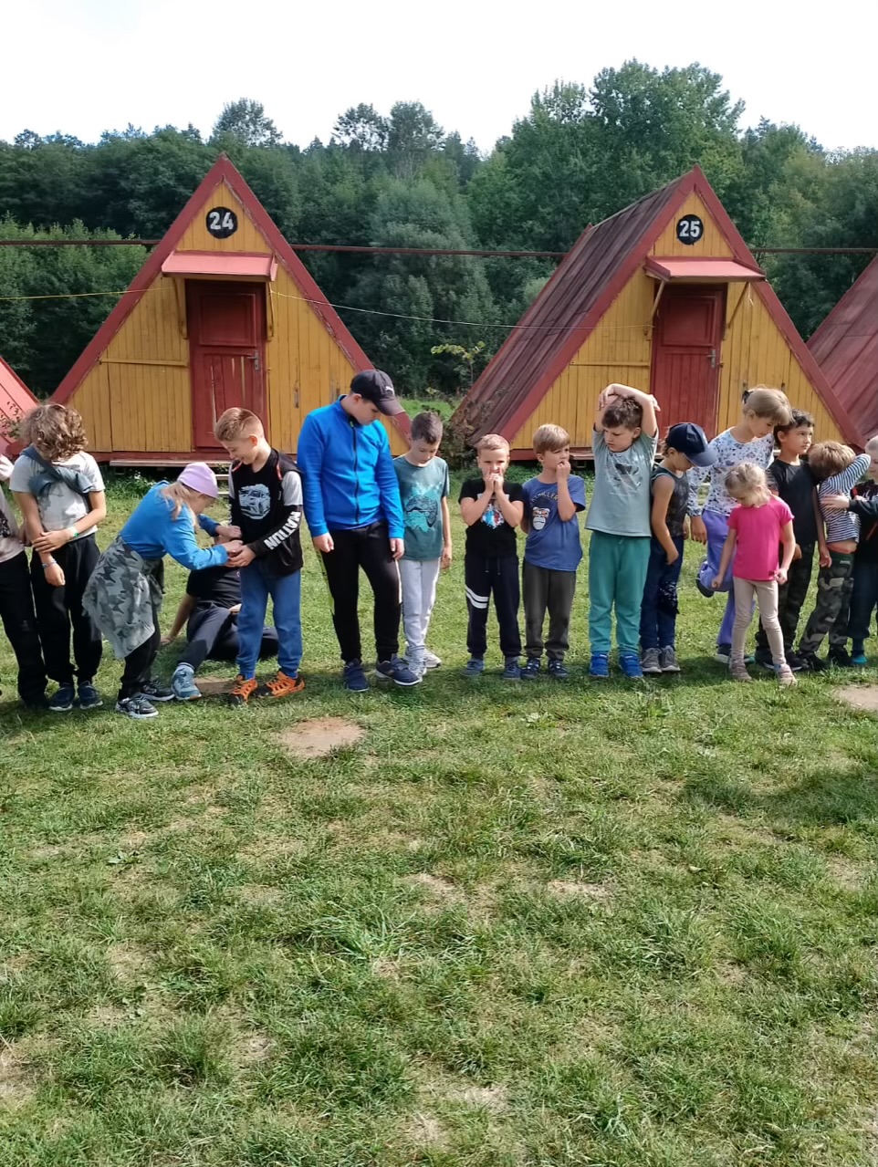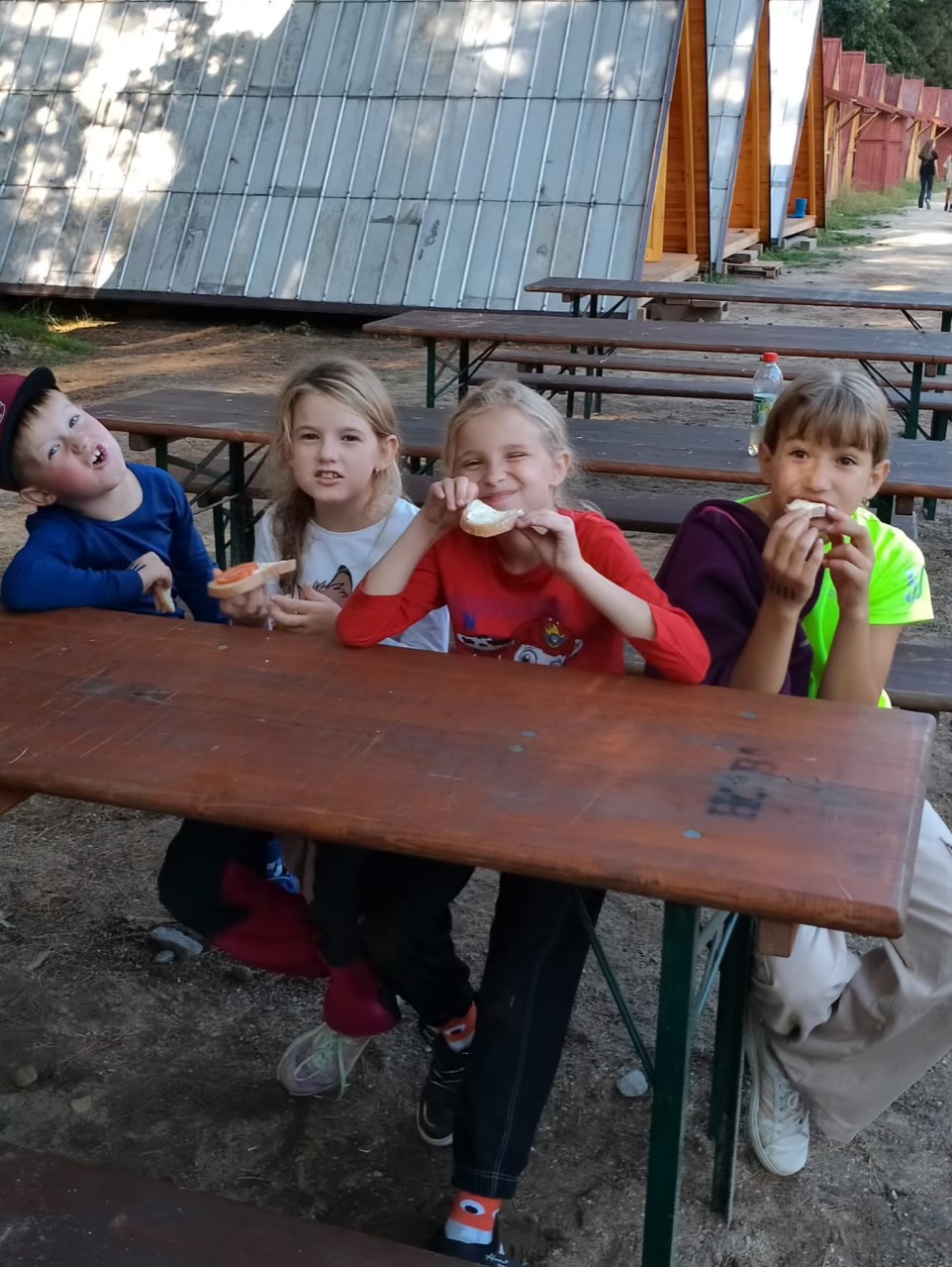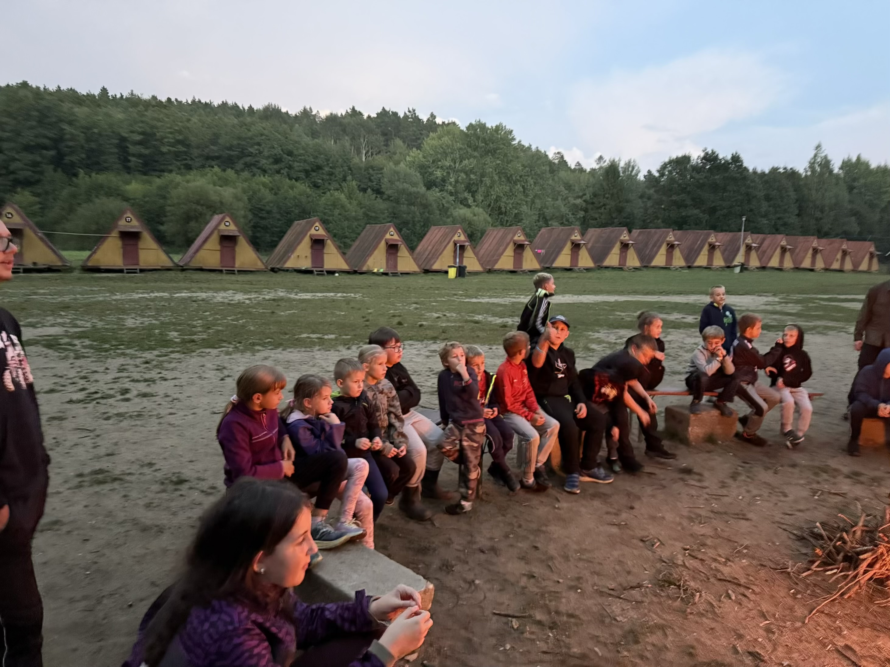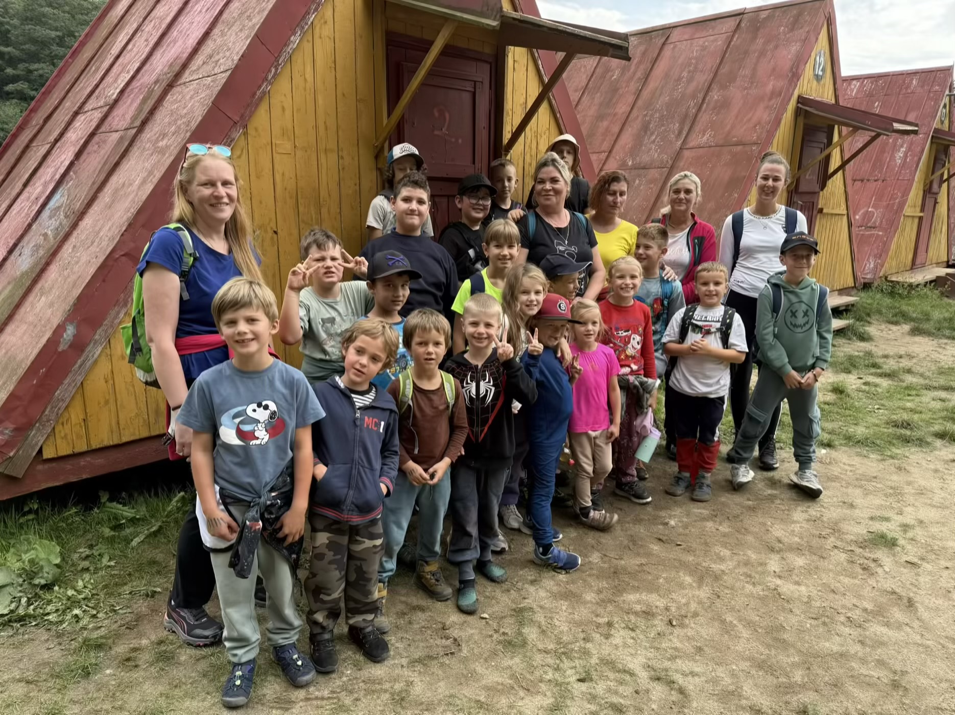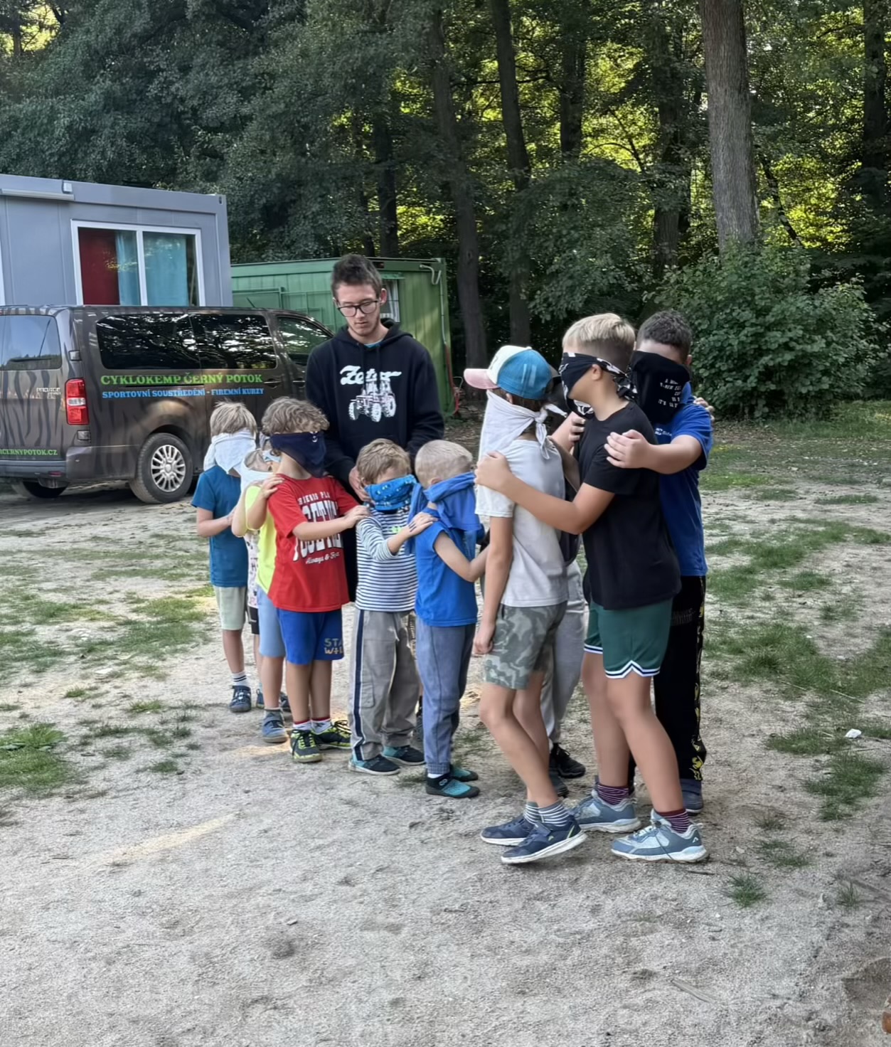 Na začátku školního roku (8.9. - 10.9.) jsme se s dětmi vydali na třídenní "Výjezd za dobrodružstvím" do Cyklokempu Černý Potok. Už první den na nás čekala pořádná porce zážitků. Po příjezdu se děti zabydlely v chatkách a hned poté se učily sbíhat na svolávací hudbu - ať už hrála nebo ne, bylo vždy veselo. Následovaly první úkoly, které děti plnily s nadšením, a večer nás čekal slavnostní táborák. Romantiku u ohně ale brzy vystřídala dramatická noční bouřka. Některé děti měly strach, ale všichni statečně vydrželi. Nikdo se nevzdal, nikdo neutekl - a to se cení!